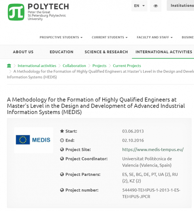 Medis in Polytechnic St. Petersburg: http://english.spbstu.ru/international/collaboration/projects/current-projects/methodology-formation-highly-qualified-engineers/